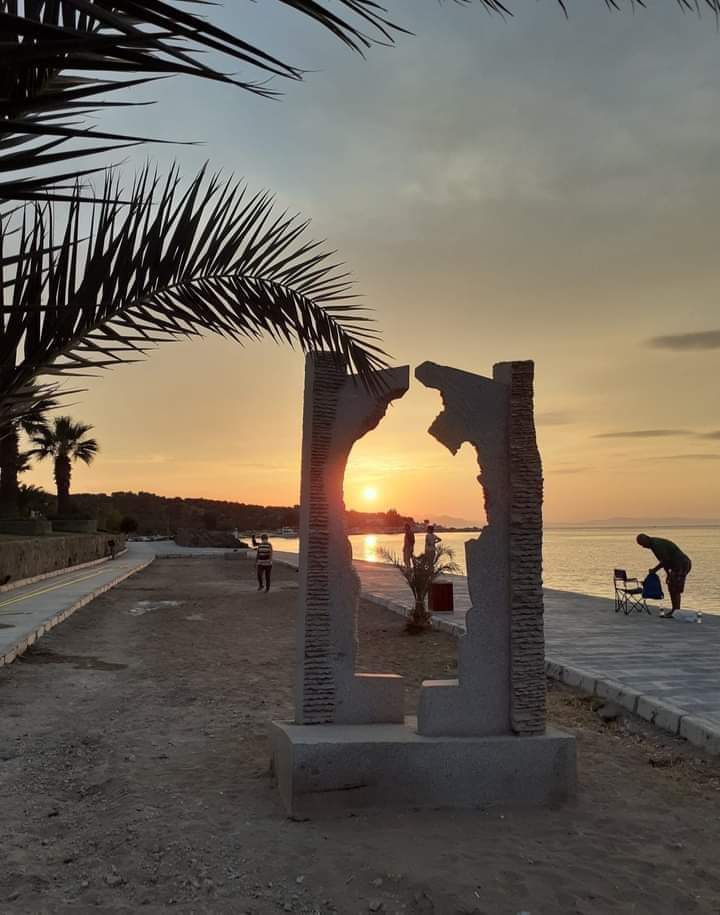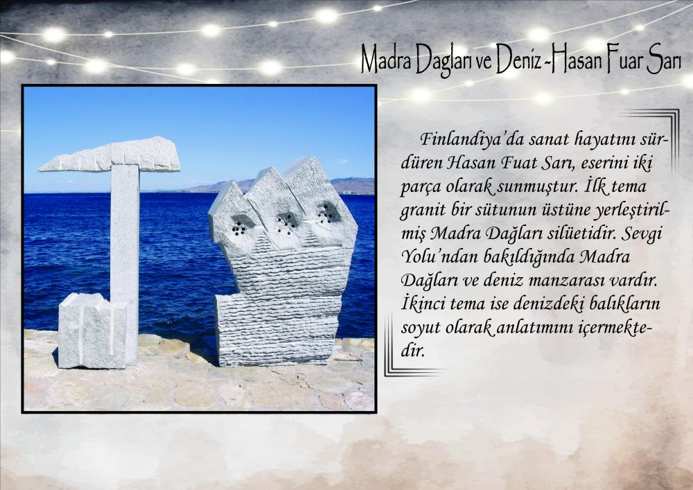 2 parçada tek bir hikayeyi anlatmaya çalışan Sempozyumun gerçekleşmesinde büyük emeği olan Hasan Fuat Sarı eserinde bir Dikili manzarası sunuyor bizlere. Madra Dağları’na yazlanmış bir Dikili körfezi ve bu denizde soyut bir şekilde konu alınmış balıklar eserin ana temasıydı. Sevgi Yolu’nda sergilenen bu esere üzülerek söylemek gerekirse en büyük saldırılar gerçekleşmiş, “orak-çekiç”in çekici denilerek Madra Dağları silüeti çeşitli Vandallıklarla karşı karşıya kalmıştı. Karyola heykeli gibi bugün aramızda olmayan eserin sadece balık simgesi kalmıştır.