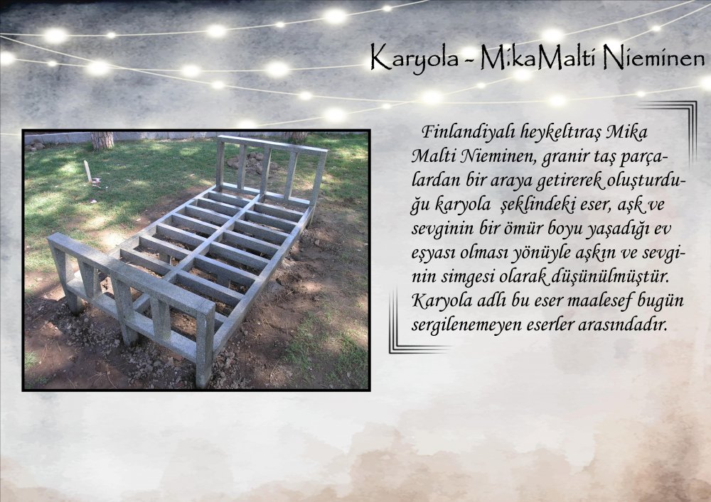 Karyola , sadece bir ev eşyası mıdır. Onu sıradan bir eşyadan ayıran en büyük özellik eşleri bir ömür boyu sırtında taşımasıdır. Aşkın ve sevginin ev sahibidir. Finlandiyalı heykeltıraş Mika Malti Nieminen hayatın içinde sevgi kavramını farklı bir açıdan değerlendirerek bu heykeli yapmış ve Dikili halkına armağan etmişti. Hükümet Konağı ve Emniyet Müdürlüğü’nün denize bakan bahçesinde sergilenmekte olan Karyola adlı eser, ağaç budaması yapılırken dikkatsizce hareket edilmesi sonucunda yere düşen dallarla birkaç yerinden kırıldı. Karyola adlı eserin hazin sonu ise çöpe atılarak gerçekleşmiştir.
