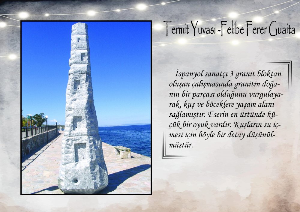 Granit taşın doğanın bir parçası ve canlılarla uyum içinde olduğu temasıyla İspanyol sanatçı Felibe Ferer Guaita Termit Yuvası adını verdiği eserini Sevgi Yolu’nun hemen girişinde sergilemişti.