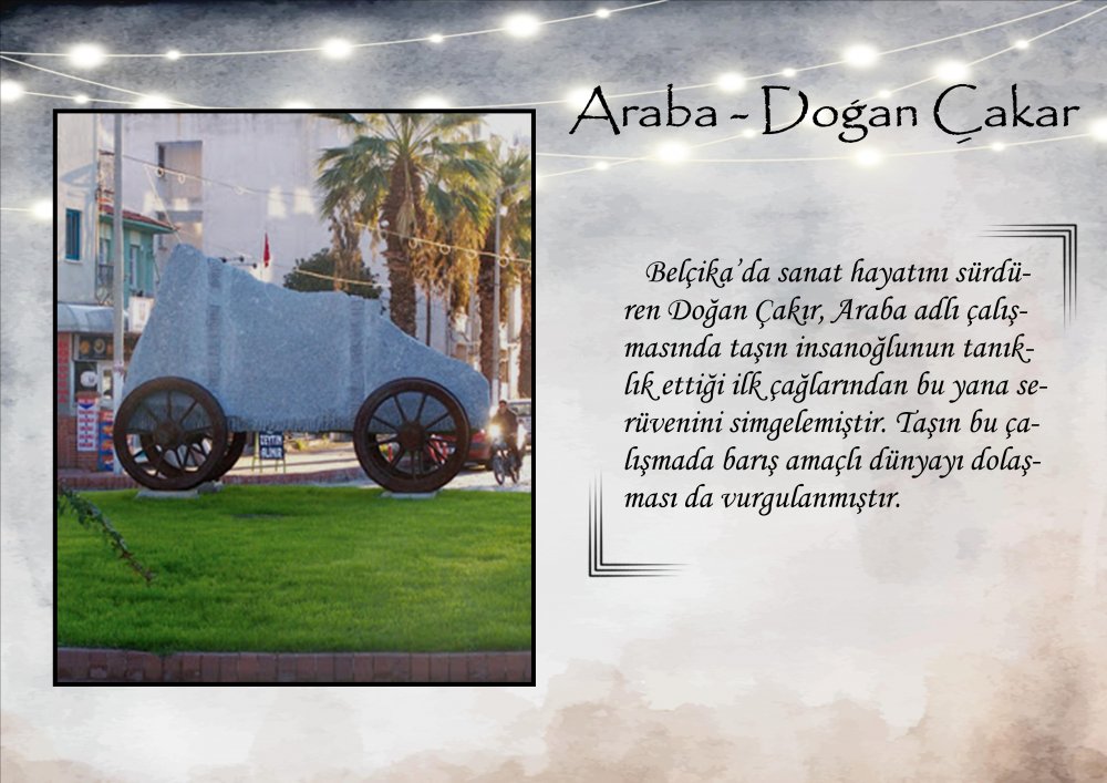 Belçika’da yaşayan Doğan Çakar’ın yaptığı Araba heykeli bugün Bülent Ecevit Heykeli’nin bulunduğu yerde sergilenmişti. Ancak Mustafa Tosun’un belediye başkanlığı döneminde meydan düzenlemesi yapılmış ve Araba heykeli Nazım Hikmet Parkı’nın girişine konularak yeni yerini almıştır.