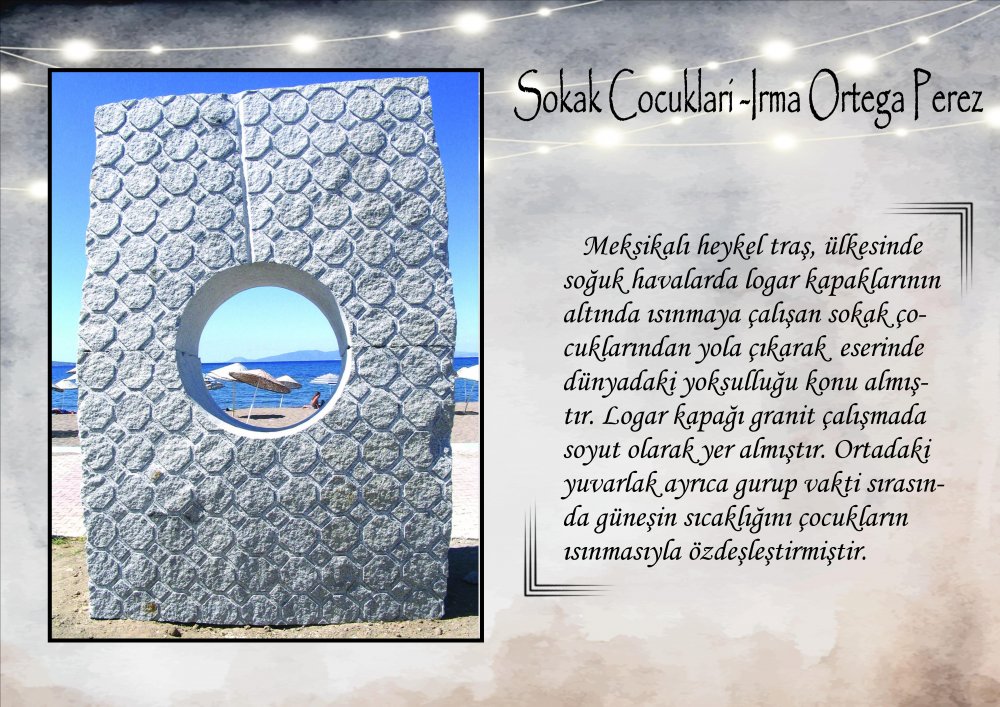 Meksikalı heykeltıraş İrma Ortega Perez’in sokak çocuklarının ısınma çabalarını Dikili’nin güneşiyle umutlandırdığı Sokak Çocukları eseri günümüzde Mavi Bayrak’ta sergileniyor.