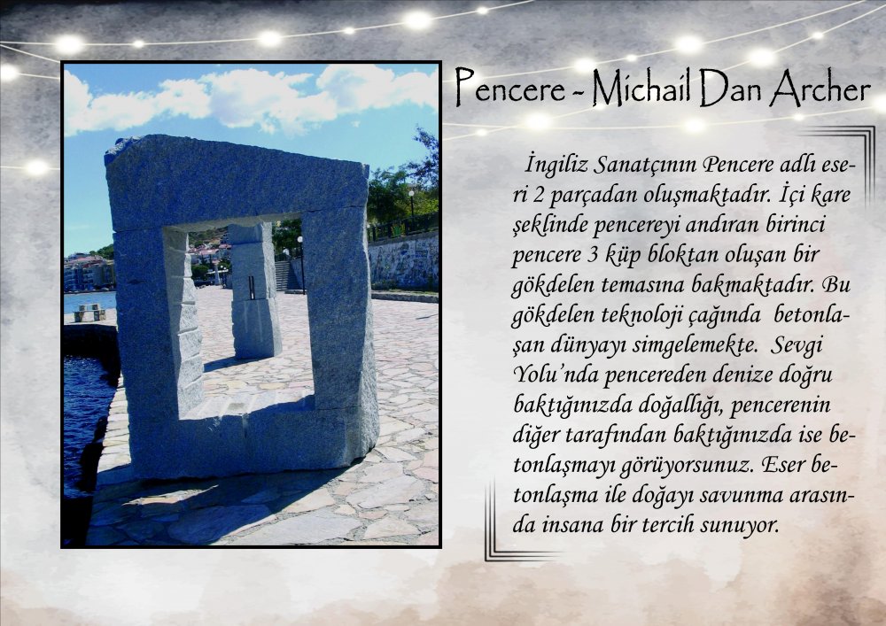 İngiliz heykeltraş Pencere adını verdiği eserinde sanatseverleri bir tercihle yüzleştiriyor. Konum bakımından Sevgi Yolu’nda sırtınızı denize verip pencereden baktığınızda şehirleşme ve betonlaşma ile karılaşırken pencerenin diğer tarafından baktığınızda tüm güzelliği ile doğayı ve gün batımını izliyorsunuz. Bu çalışma doğa ile betonlaşma arasında bir tercih yapmamız konusunda sorgularla dolu.