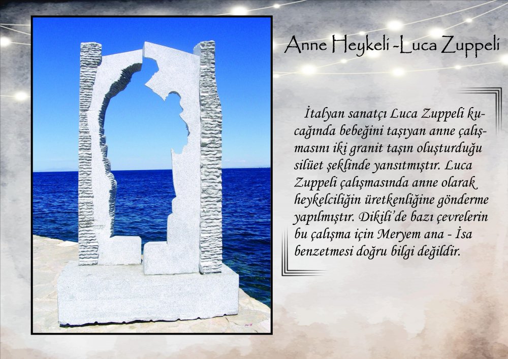 Belki de sempozyumdan bu yana en çok konuşulan, en çok beğenilen ve en çok fiziki olmasa da düşünsel olarak saldırıya uğrayan, siyaset malzemesi yapılan Anne ve çocuk eseri ile Luca Zuppeli sadece anneyi konu almıştır. Tek bir açıdan bakıldığında kucağında bebeğiyle bir anne silüetini görmekteyiz. Ama sanattan uzak çevrelerin bu silüeti Meryem Ana ve Hz. İsa’ya benzeterek Dikili siyasetinde konuyu “hıristiyan, Yunan sevicisi” başlığıyla değerlendirmeleri, Luca Zuppeli’nin anne ve çocuk kadar masum bir sevgiyi anlatmasının çok uzağında sadece küçük bir artniyet olarak kalmıştır.