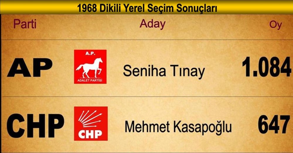 1973 Yerel Seçimleri’nde Dikili’de bir ilk yaşandı. İlk defa bağımsız bir aday seçimleri kazanıyordu. Kazanan isim 3. defa Seniha Tınay’dı.
