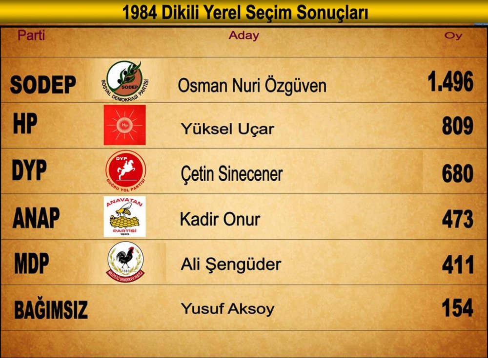 ANAP, 1984 Yerel Seçimleri’nde ülke genelinde 1. Partiydi. DYP 2., Halkçı Parti 3., Refah Partisi 4. olurken Sosyal Demokrasi Partisi (SODEP) 5. Partiydi. Dikili yerel siyasetine geldiğimizde siyasi dengelerin önceki seçimlere göre çok farklı olduğunu görmekteyiz. 12 Eylülden sonra kurulan SODEP'in adayı Osman Özgüven 1496 oyla seçimlerin galibi oluyordu.