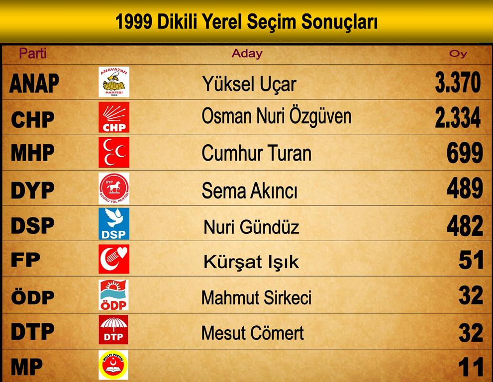 Osman Özgüven 2351 oyla seçimi kazanarak bir kez daha belediye başkanı oluyordu. Merkez sağın oyları bölünürken, seçmen analizi yapacak olursak, Dikili’de merkez sağ partilere oy veren seçmenin büyük bölümü, Türkiye genelinde Anavatan Partisi en güçlü olduğu dönemi yaşarken Demokrat Parti geleneğini sürdürerek DYP adayı Cumhur Turan’ı desteklemişti.