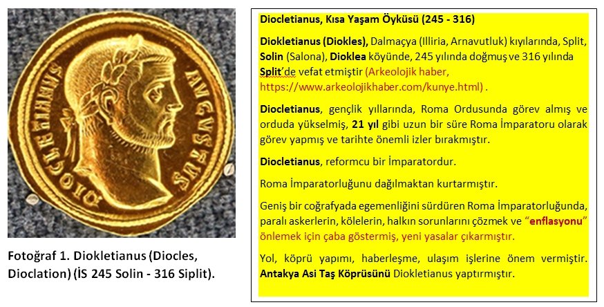 Diokletianus (Diocletinanus) (İS 245 Solin-316 Split) (Fotoğraf 1), 51. Roma İmparatoru olup, egemen olduğu dönemde yeni yasalar çıkarmış, yönetimde yenilik yapmış, “Dörtlü Yönetimi” kurmuş ve İmparatorluğu dağılmaktan kurtarmıştır.