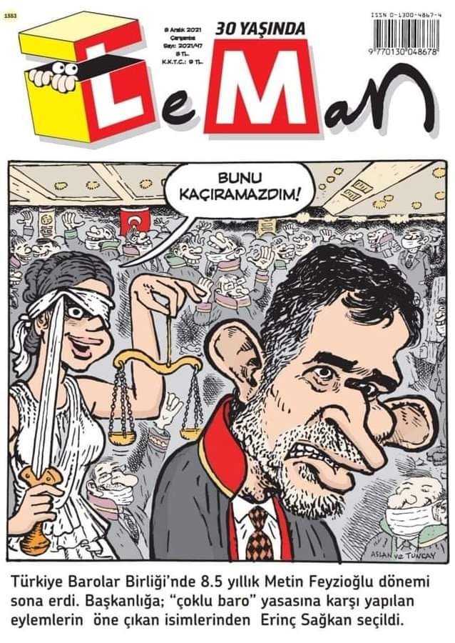 LeMan Dergisi kapağında Adalet Tanrıçası Themis'in bile gözbağını çözerek kaybedişini kaçırmayışının(!) çizildiği Feyzioğlu...