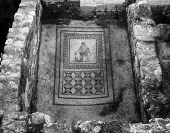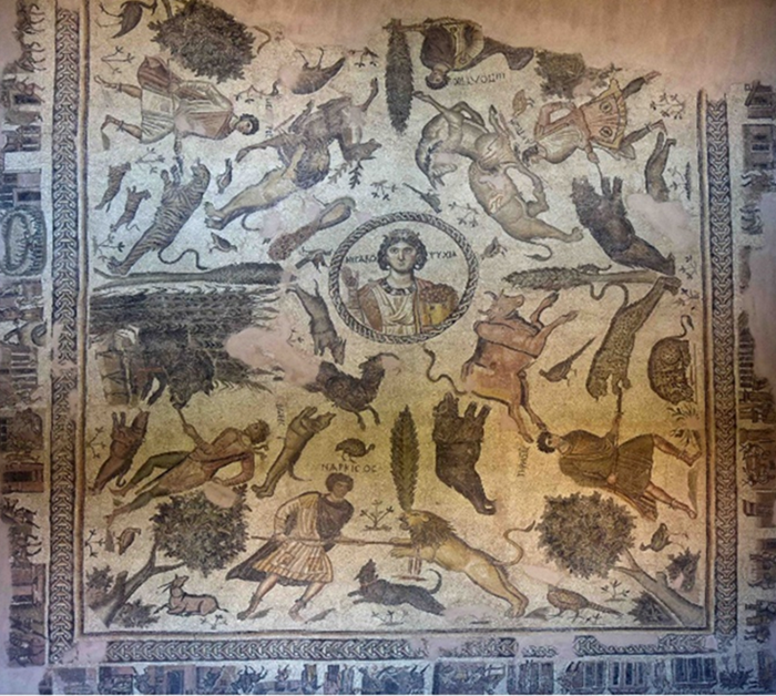 Fotoğraf 1. Yakto (Gümüşgöze) Mozaiği. Fransız arkeolog Claude M Prost tarafından, 1932 yılında, Defne’nin Yakto (Gümüşgöze) köyünde 1932 yılında yapılan kazıda bulunmuştur. Hatay Arkeoloji müzesindedir.