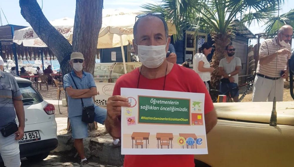 İzmir’in Dikili İlçesi’nde Eğitim-Sen tarafından Covid-19 salgını nedeniyle seminerlerin online yapılmasına ilişkin basın açıklaması yapıldı. Basın açıklamasında; "1 milyon öğretmenin yaşamı tehlikeye atılmamalı ve yılsonu mesleki çalışma programı uzaktan yapılmalıdır" denildi.
