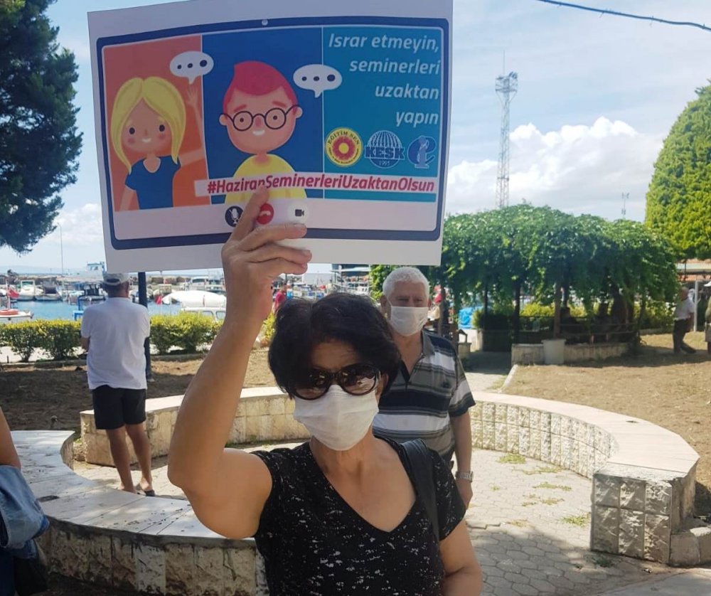 “19 Haziran’a kadar yürütülen çalışmalar, eğitim öğretim faaliyetleri uzaktan eğitim ile sürdürülmüşken yılsonu seminerlerinin salgının hala devam etmesine rağmen uzaktan değil de yüz yüze, kurumlarımızda yapılmasını anlamak bizim açımızdan anlaşılır değildir. Bu kararla bazı okullarda yüzlerce öğretmenin biraya geleceği bir ortamda salgın tehlikesi ortadan kalkmadan fiziksel mesafenin korunacağının ve maske takmanın sağlanacağının garanti altına alınmadığı, özellikle büyük şehirlerde yaşayan birçok öğretmen arkadaşımız toplu taşım aracı kullanmak zorunda olacağı, farklı illerden gelen öğretmenlerin bir araya gelmesi ile yeni bir temas grubunun oluşturacağı bunun da başlı başına bir risk olduğu, bilim insanlarının Covid-19 virüsünü taşıyan binlerce gizli taşıyıcın bulunabileceği yönünde uyarılar yaptığı koşullarda bu çalışmalara katılan öğretmen, eğitici tüm ilgililerin yaşam hakkı tehlikeye atılmaktadır”