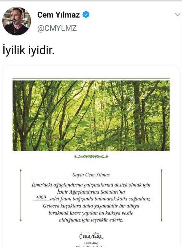 Cem Yılmaz, sosyal medya hesabı üzerinden İzmir'e dört bin adet fidan bağışlaması üzerine TEMA tarafından verilen teşekkür belgesini paylaşarak "İyilik, iyidir" ifadelerini kullandı.