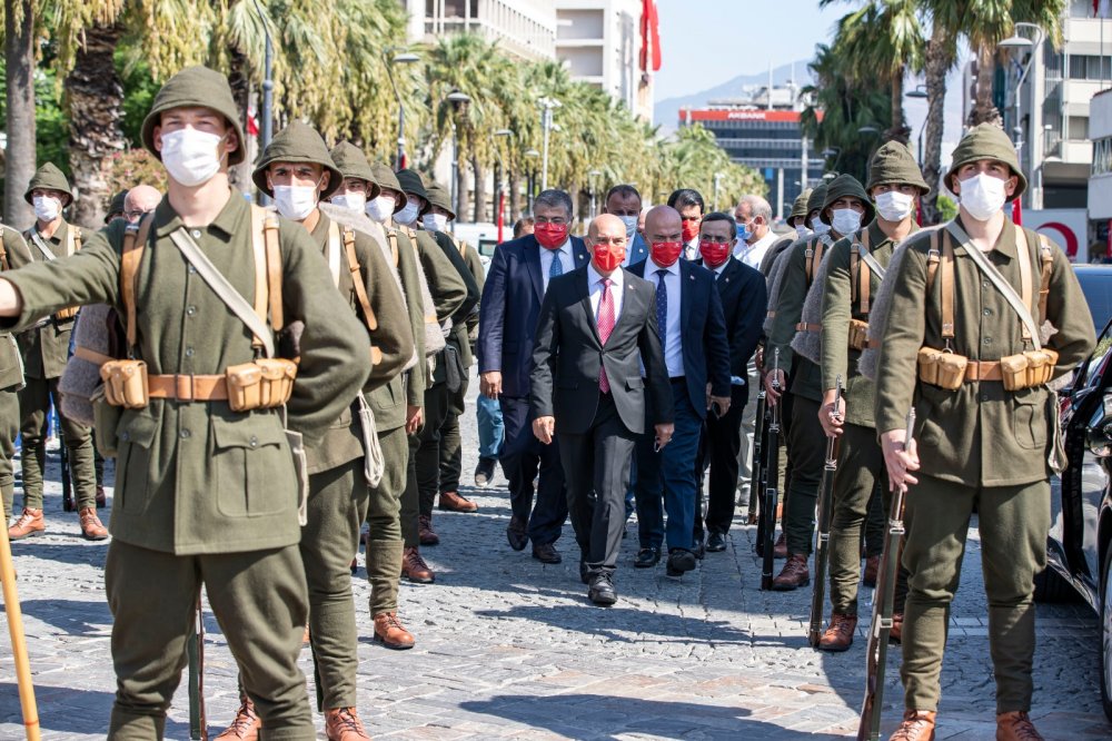 Daha sonra konuşma yapan İzmir Büyükşehir Belediye Başkanı Tunç Soyer, 9 Eylül'ün İzmir’in kurtuluşu ve Cumhuriyet’e giden taşların döşendiği sürecin başladığı gün olduğunu söyledi. Dünya halklarına örnek bir bağımsızlık mücadelesi ve özgürlük hikayesinin ilk cümlelerinin 98 yıl önce burada, İzmir’de yazıldığını belirten Tunç Soyer, “Şüphesiz her ülkenin, her milletin tarihinde zaferler ve kahramanlık destanları var. Ve elbette her toplum, bu destan ve öykülerle haklı bir övünç yaşar. Ancak bize kahramanlarımızın bıraktığı destan, bu şehrin parçası olan bizleri, çok ayrı gururlandırıyor” dedi.