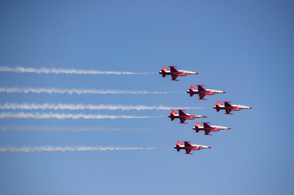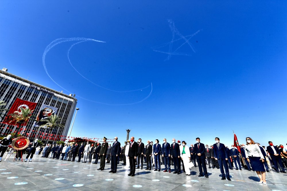İzmir'in kurtuluşunun 98. yıldönümü etkinlikleri, Cumhuriyet Meydanı'nda düzenlenen törenle devam etti. Türk Yıldızları ve Solotürk, tören boyunca selamlama uçuşu yaptı.