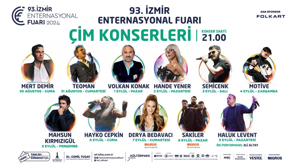 Ziyaretçiler, Fuar akşamlarında keyif dolu anlar yaşamak için her yıl olduğu gibi bu yıl da Fuar konserlerinde buluşacak. Çim Konserleri’nin ilki, Fuar’ın ilk günü olan 30 Ağustos Zafer Bayramı’nda Mert Demir ile başlayacak. Sırasıyla Teoman, Volkan Konak, Hande Yener, Semicenk, Motive, Mahsun Kırmızıgül, Hayko Cepkin ile Migros sponsorluğunda Derya Bedavacı ve Sakiler sahne alacak. Coşku, 9 Eylül’de İzmir’in kurtuluşunun 102. yılında Haluk Levent konseriyle zirveye çıkacak. Alternatif Sahne’de ise konserler 31 Ağustos'ta başlayacak. İlk akşam Pera, sonrasında ise Melis Fis, Anıl Piyancı, Perdenin Ardındakiler, Redd, Şanışer&Sokrat St, Ceylan Ertem, Yedinci Ev ve Can Gox sahne alacak.