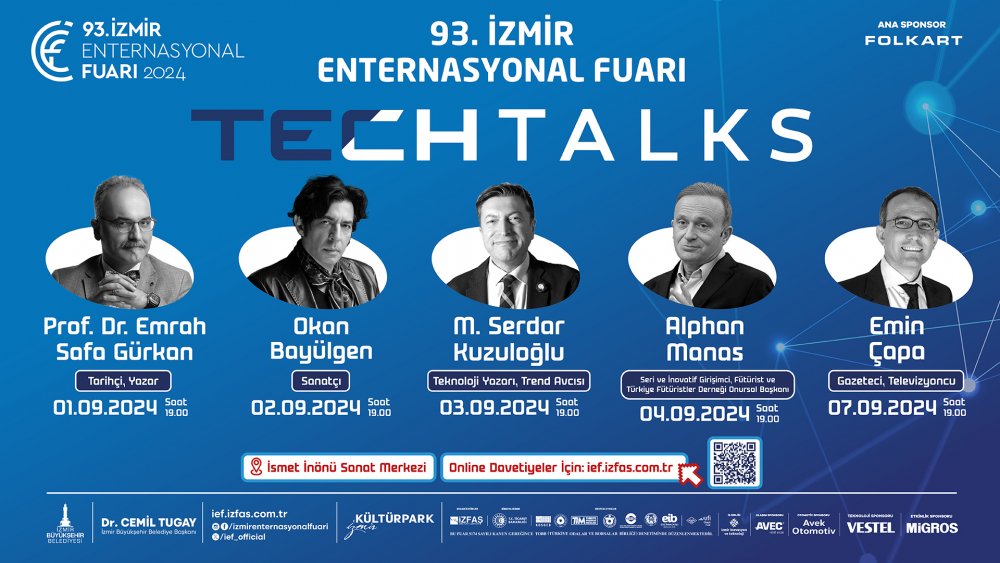 İZFAŞ ve İzmir İnovasyon ve Teknoloji AŞ’nin birlikte düzenlediği ‘Tech Talks’ isimli söyleşilerde, Türkiye’nin merakla, ilgiyle, bilgilenerek dinlediği isimler, İsmet İnönü Sanat Merkezi’ndeki Tech Talks etkinliğinde buluşacak. 1 Eylül günü tarihçi, akademisyen Prof. Dr. Emrah Safa Gürkan, 2 Eylül’de sanatçı Okan Bayülgen, 3 Eylül’de teknoloji yazarı, trend avcısı Serdar Kuzuloğlu, 4 Eylül’de seri ve inovatif girişimci, fütürist ve Türkiye Fütüristler Derneği Onursal Başkanı Alphan Manas, 7 Eylül’de gazeteci ve televizyoncu Emin Çapa konuşmacı olarak yer alacak.
