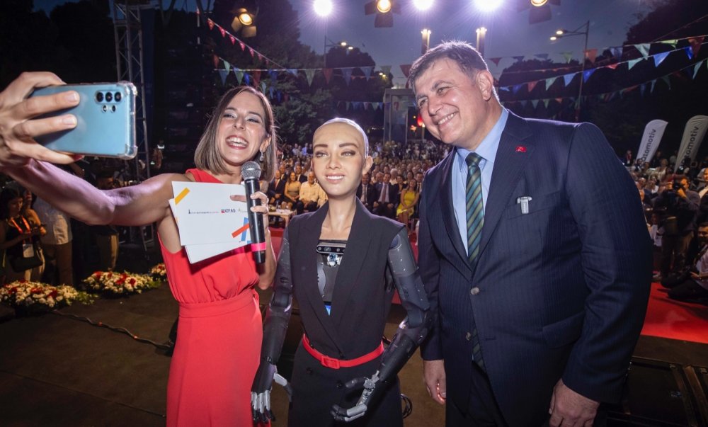 Teknoloji temasıyla yapılan İzmir Enternasyonal Fuarı'nın merakla beklenen sürpriz konuğu da açılışta sahnedeydi. Konuk robot Sophia, alkışlar ve meraklı bakışlar eşliğinde kendisini izleyenlerle buluştu. Robot Sophia, “Sürpriiiiz! Merhaba İzmir! Türkiye'nin ilk ve 93 yıldır devam eden en köklü fuarına beni davet etmenizi bekliyordum! Sonunda geldim” diyerek sahnedekileri selamladı. 93. İEF'in birçok teknolojik ilke yıllar içinde ev sahipliği yaptığını hatırlatan robot Sophia, Atatürk'ün “Milletin bağımsızlığını yine milletin azim ve kararı kurtaracaktır” sözünü hatırlatarak 30 Ağustos Zafer Bayramı’nı kutladı. Akıllı trafik sistemlerinden sürdürülebilir enerji yönetimine, iklim değişikliği ve afet konularından şehir planlamasına kadar pek çok alanda yapay zekadan faydalanma konusuna değinen robot Sophia, “İzmir bu iş için biçilmiş kaftan!” dedi. Sophia ile sahnede buluşan İzmir Büyükşehir Belediye Başkanı Dr. Cemil Tugay ise “Heyecan ve şaşkınla izledik kendisini. Bir robot tarafından ilk defa 30 Ağustos Zafer Bayramı'mız kutlandı. Hoş geldin Sophia” dedi. Sophia, Başkan Tugay ile sahnede selfie çekildi.