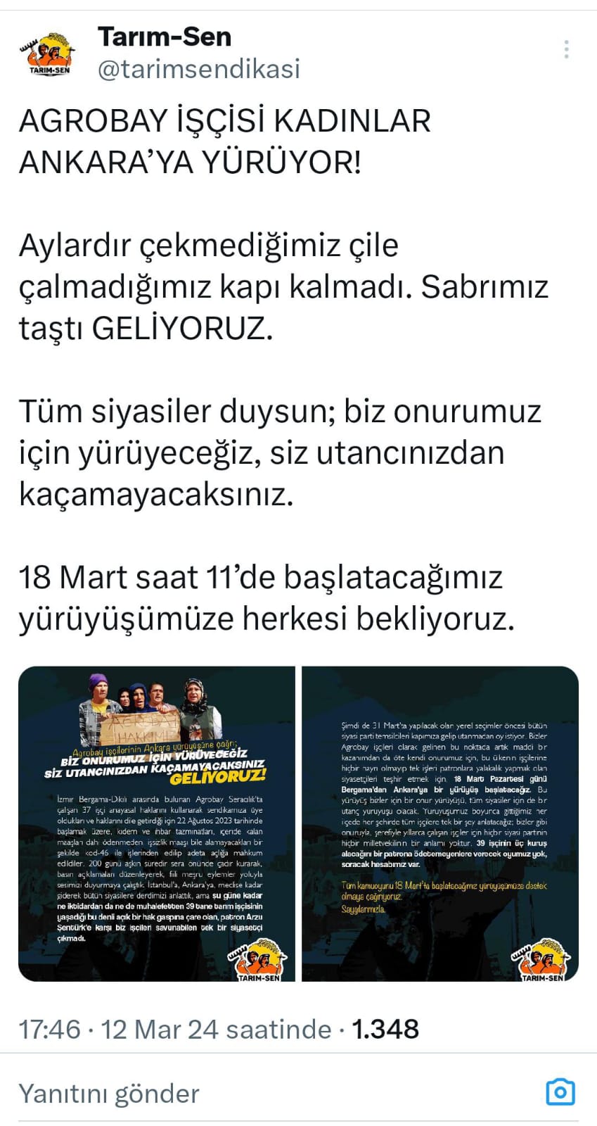 “31 Mart’ta yapılacak olan yerel seçimler öncesi bütün siyasi parti temsilcileri kapımıza gelip utanmadan oy istiyor. Bizler Agrobay işçileri olarak gelinen bu noktada artık maddi bir kazanımdan da öte kendi onurumuz için, bu ülkenin işçilerine hiçbir hayrı olmayıp tek işleri patronlara yalakalık yapmak olan siyasetçileri teşhir etmek için, 18 Mart Pazartesi günü Bergama’dan Ankara’ya bir yürüyüş başlatacağız. Bu yürüyüş bizler için bir onur yürüyüşü, tüm siyasıler için de bir utanç yürüyüşü olacak. Yürüyüşümüz boyunca gittiğimiz her ilçede her şehirde tüm işçilere tek bir şey anlatacağız; bizler gibi onuruyla, şerefiyle yıllarca çalışan işçiler için hiçbir siyasi partinin hiçbir milletvekilinin bir anlamı yoktur. 39 işçinin üç kuruş alacağını bir patrona ödetemeyenlere verecek oyumuz yok, soracak hesabımız var. Tüm kamuoyunu 18 Mart’ta başlatacağımız yürüyüşümüze destek olmaya çağırıyoruz”