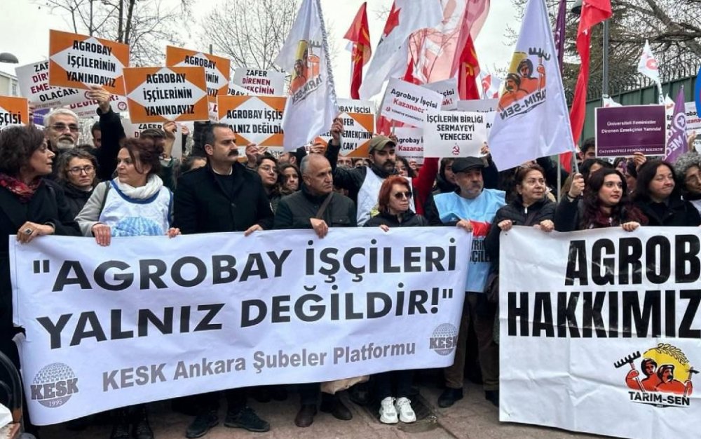 Görüşme sürerken baknalık önünde bekleyen işçiler "Agrobay işçisi köle değildir", "Sendika haktır engellenemez" ve "Agrobay hakkımızı ver" sloganları attı. "Bizden çaldığınız her şeyi geri alacağız" pankartı açtı.
