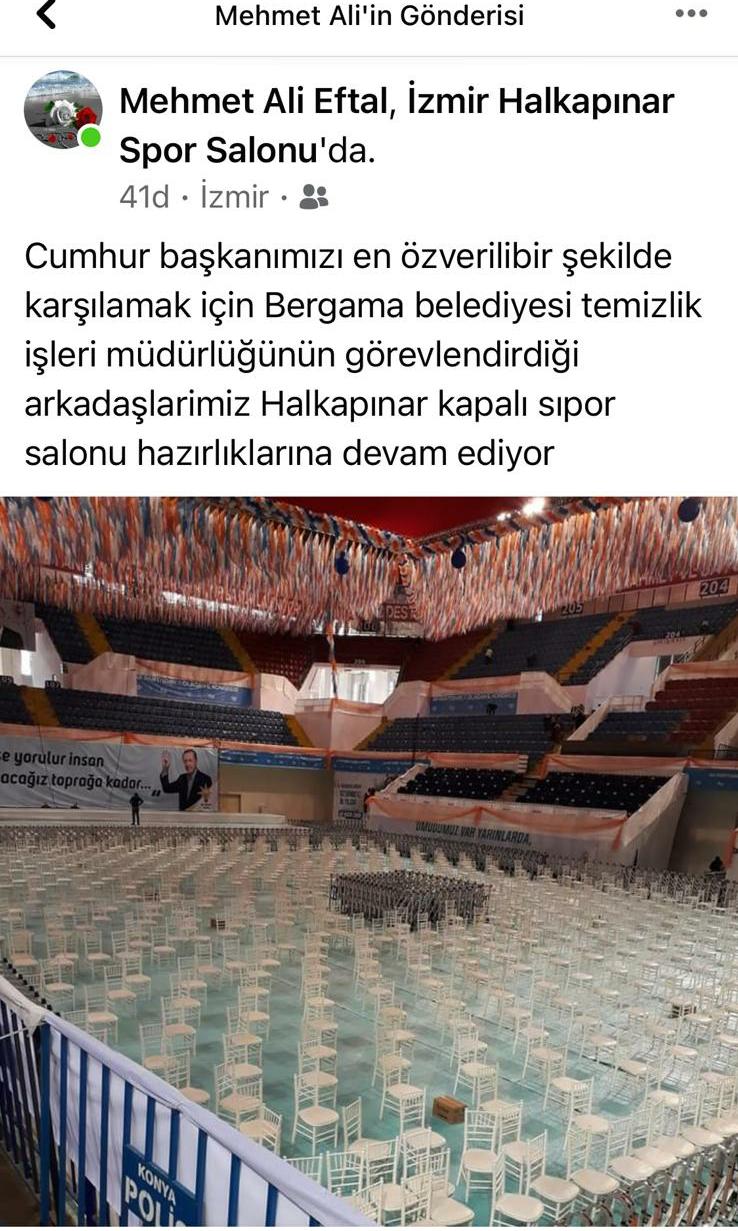 Mehmet Ali Eftal'ın sosyal medya hesabı üzerinden yaptığı paylaşımda, "Cumhurbaşkanımızı en özverili şekilde karşılamak için Bergama Belediyesi Temizlik İşleri Müdürlüğü'nün görevlendirdiği arkadaşlarımız Halkapınar Kapalı Spor Salonu'nda hazırlıklarına devam ediyor" denildi.