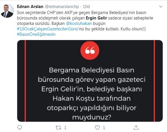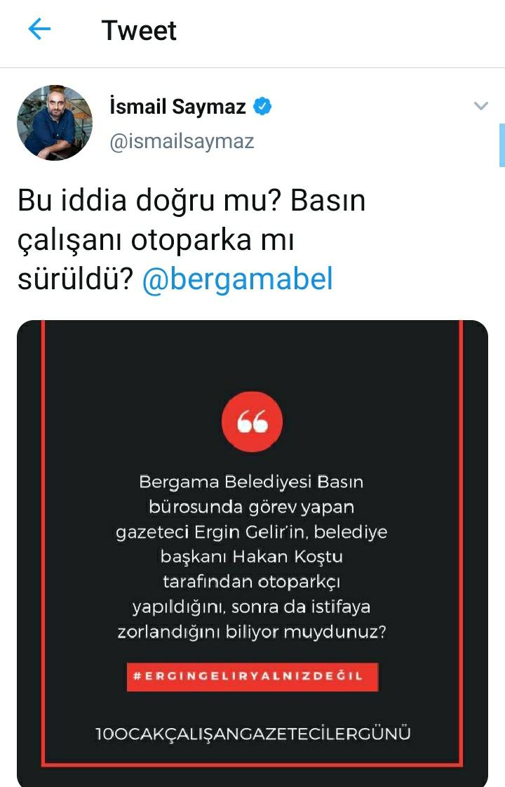 10 Ocak Çalışan Gazeteciler Günü vesilesiyle konunun bir kez daha gündeme gelmesiyle birlikte İz Gazete’ye konuşan ve yaşadıklarını anlatan Ergin Gelir, Bergama Belediyesi tarafından kendisine yapılan yeni görevlendirme sonrasında istifa ettiğini aktardı. “Mesleğime olan saygım ve inancım gereği tabi görevlendirmeyi kabul etmedim. İstifa ettim ve haklarımı talep ettim” ifadelerini kullanan Gelir, ayrıca yasal sürecin de devam etmekte olduğunu kaydetti.
