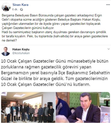 Yaşanan duruma birçok gazete örgütleri tepki gösterirken, bir açıklamada gazeteci Sinan Kara'dan geldi. Kara sosyal medya üzerinden meslektaşlarını eleştirdi. Açıklamada; "Bergama Belediyesi Basın Bürosunda çalışan gazeteci arkadaşımız Ergin Gelir'i otoparka sürme acizliğini gösteren Belediye Başkanı Hakan Koştu, yaptığından utanmadan bir de ilçede görev yapan gazetecileri toplayarak Çalışan Gazetecilerin gününü kutluyor. Hadi bu samimiyetsiz başkanın utanç duyulması gereken davranışını şimdilik bir tarafa koyalım. Peki, bu toplantıda (kahvaltıda) bir araya gelen gazetecilere ne demeli?
