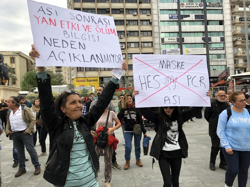 Aşı karşıtları İstanbul ve Ankara'dan sonra bu kez İzmir'de düzenlenen mitingde bir araya geldi. 'Büyük Uyanış' adı altında Bornova Cumhuriyet Meydanı'nda düzenlenen miting öncesinde polis çevrede geniş güvenlik önlemleri aldı.