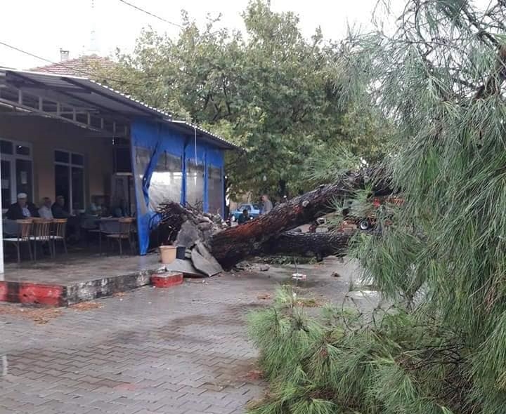 Hortum çıktı, bazı ağaçlar evlerin üzerine devrildi. Ekili alanlar ve zeytin ağaçları büyük hasar gördü.
