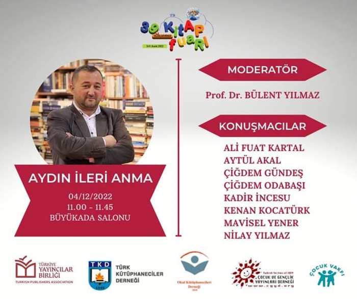 4 Aralık'ta; 39.Uluslararası İstanbul Kitap Fuarı'nda anılacak olan Araştırmacı-Yazar Aydın İleri'nin adı, kendi tavsiyesi üzerine İstanbul Büyükşehir Belediyesi tarafından yaptırılan Muzaffer İzgü Kütüphanesinde bir kata verilecek.