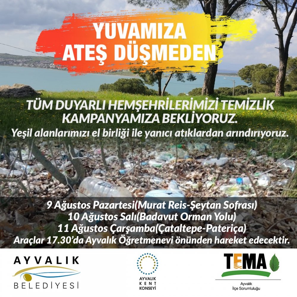 Ayvalık Belediyesi, TEMA, Ayvalık Kent Konseyi işbirliğinde bir hafta süreyle, “Yuvamıza Ateş Düşmeden” adı altında geniş katılımlı orman temizliği kampanyası başlatıldı.