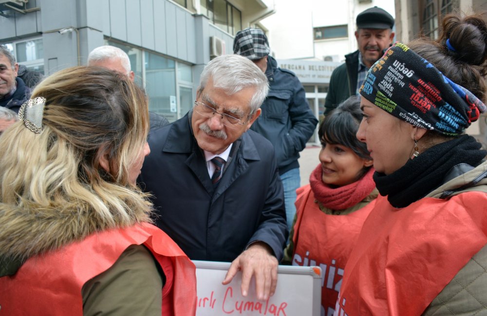 Bergama Belediyesi’nin işten çıkardığı 3 kadın işçinin üzerlerinde “işimi istiyorum” yazılı yeleklerle mesai saatleri içinde başlattıkları hak arama mücadelesinin 12.gününde CHP İzmir Milletvekili Kani Beko destek ziyaretinde bulundu. Ziyarete CHP İlçe Başkanı Mehmet Ecevit Canbaz ve CHP’li meclis üyeleri ile üyelerde eşlik etti. Aliağa Emekli-Sen Şube Başkanı Sabahattin Yeşil ve Emekli-Sen üyeleri, DİSK 4 No’lu Şube Başkanı Aydın Tekin, CHP İl Yönetiminden Ali Rıfat Koç, Dikili Kadın Platformu ve Bergama Demokrasi Platformu da 3 kadın işçiyi yalnız bırakmadı. Ziyaret sonrası saat 17.30’dan itibaren ise 3 kadın işçinin hak arama eylemine Cumhurbaşkanı Recep Tayyip Erdoğan’ın ilçeye ziyareti ve güvenlik önlemleri nedeniyle 1 hafta yasaklama geldi.