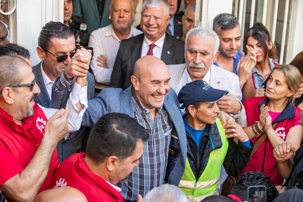 Konak’taki Tarihi Belediye Binası’nın önünde sabah 07.30’dan itibaren toplanmaya başlayan işçiler Başkan Tunç Soyer’e “Asla yalnız yürümeyeceksin” sloganlarıyla sahip çıktı.