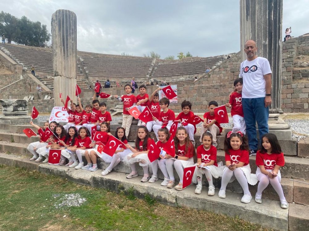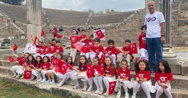 Atatürk'ün de 1934 yılında ziyaret ettiği Bergama'nın 2 bin yıllık tarihi Asklepeion alanında, 29 Ekim Cumhuriyet Bayramı ve Türkiye Cumhuriyeti'nin 100'üncü yılını kutladı. 'Cumhuriyet Çocukları' marşını söyleyen öğrenciler ellerindeki bayrakları salladı.