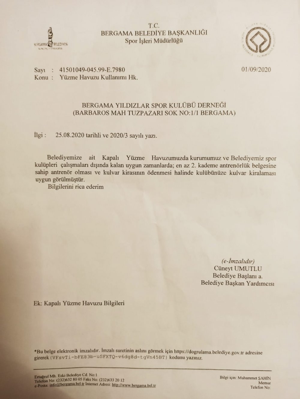 Kutlu ayrıca; "Bergama Belediyesi bünyesinde bulunan kapalı yüzme havuzunun yüzme kulvarını kullanmak için kulvar kiralama tahsisinde bulunduk. Kendileri uygun saatlerde 2’inci kademe antrenör ve kulvar kirasını ödeme şartı ile havuzu verebileceklerini söylediler. Bizde şartları yerine getirip, ödememizi yapıp dekontumuzu da aldık. Ardından verdikleri izine mahsuben bir dilekçe yazdık. Ancak havuza uygun saatlerde girmek için dilekçemize cevap gelmedi”