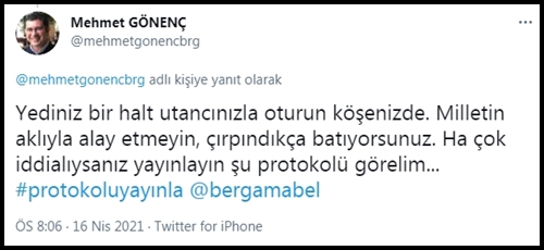 “Yediniz bir halt utancınızla oturun köşenizde. Milletin aklıyla alay etmeyin, çırpındıkça batıyorsunuz. Ha çok iddialıysanız yayınlayın şu protokolü görelim...” ifadelerine yer verdi.