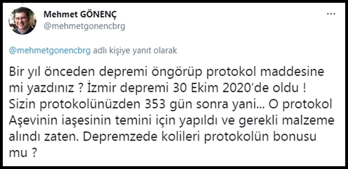 “Bir yıl önceden depremi öngörüp protokol maddesine mi yazdınız? İzmir depremi 30 Ekim 2020’de oldu! Sizin protokolünüzden 353 gün sonra yani... O protokol Aşevinin iaşesinin temini için yapıldı ve gerekli malzeme alındı zaten. Depremzede kolileri protokolün bonusu mu?”