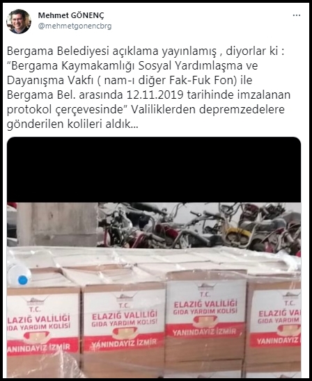 Bergama Belediyesi tarafından yazılı olarak yapılan açıklamaya ise yanıt gecikmedi. Bergama’nın önceki dönem Belediye Başkanı Mehmet Gönenç, Twitter üzerinden yaptığı paylaşımda; “Bergama Belediyesi açıklama yayınlamış, diyorlar ki: ‘Bergama Kaymakamlığı Sosyal Yardımlaşma ve Dayanışma Vakfı (nam-ı diğer Fak-Fuk Fon) ile Bergama Belediyesi arasında 12.11.2019 tarihinde imzalanan protokol çerçevesinde’ Valiliklerden depremzedelere gönderilen kolileri aldık...”