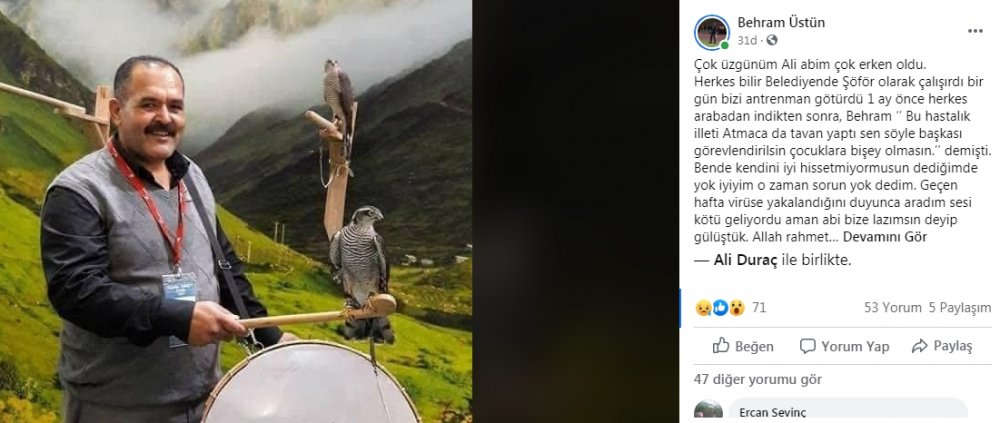 Bergama Belediyespor Teknik Direktörü Behram Üstün, Ali Duraç’ın ölümüyle ilgili üzüntüsünü dile getirdiği paylaşımda; “Herkes bilir belediyede şoför olarak çalışırdı. Bir gün bizi antrenman götürdü. 1 ay önce herkes arabadan indikten sonra, ‘Behram bu hastalık illeti Atmaca da tavan yaptı. Sen söyle başkası görevlendirilsin, çocuklara bir şey olmasın’ demişti” cümlelerine yer verdi.