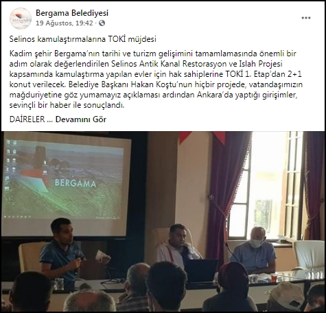 Söz konusu kararın Resmi Gazete’de yayımlanmasının ardından, tarihi ev ve dükkânlarını bırakmak istemeyen vatandaşlar şimdide Bergama Belediyesi tarafından paylaşılan; “Selinos Antik Kanal Restorasyon ve Islah Projesi kapsamında kamulaştırma yapılan evler için hak sahiplerine TOKİ 1. Etap’dan 2+1 konut verilecek” ifadelerine tepki gösterdi.