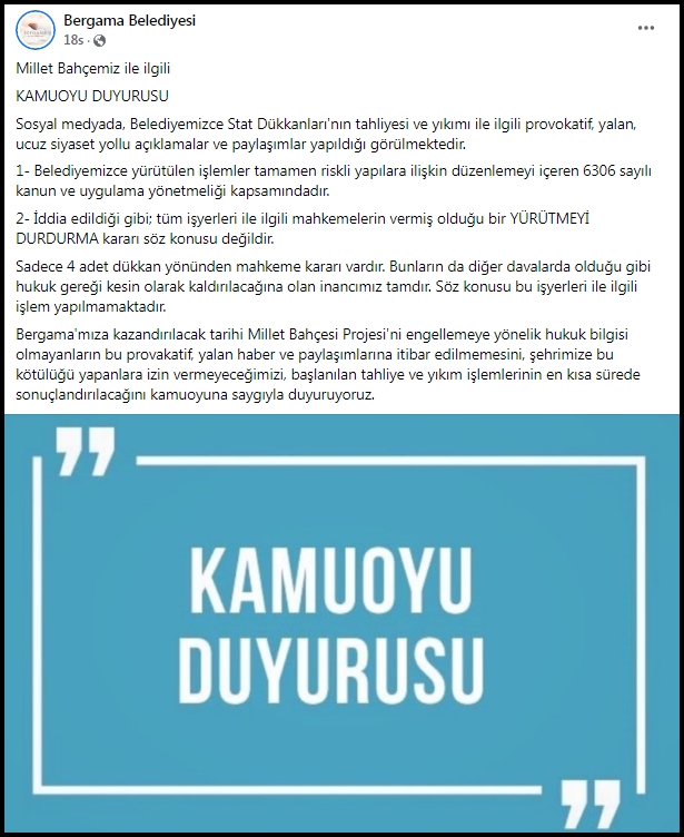 Millet Bahçesi yapılacağı gerekçesi ile tek katlı stat dükkânlarını daha önce depreme dayanıksız diyerek ‘riskli yapı’ olarak gösteren ve elektriklerini kesen belediye yönetiminin yaptığı açıklamaya stat esnafından yanıt geldi. Bergama Belediyesi’nin sosyal medya üzerinden yaptığı açıklamanın altına vatandaşlarda yazdıkları yorumlarla tepki gösterdi.