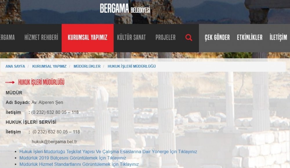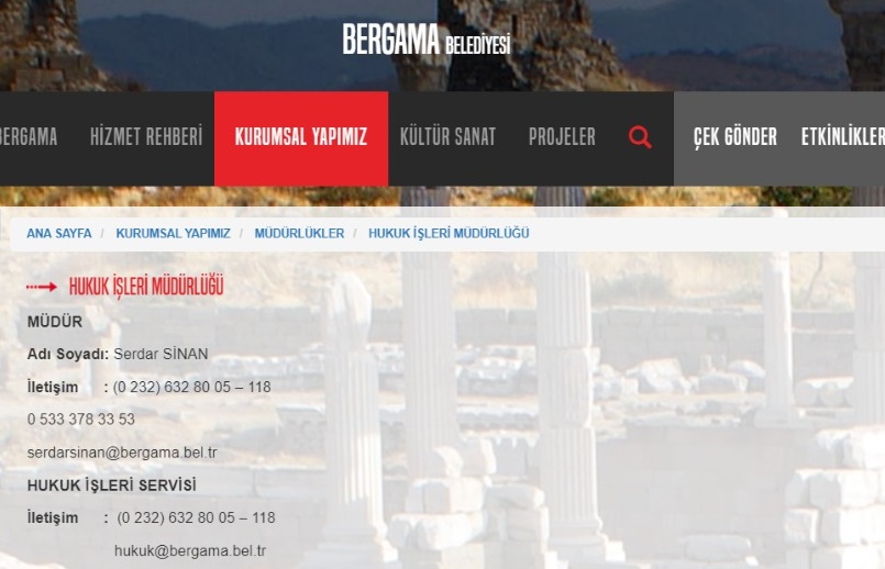 Bergama Belediyesi resmi web sitesinde Hukuk Müdürü olarak, belediye çalışanı ve memuru olmayan bir avukatı gösterdi.