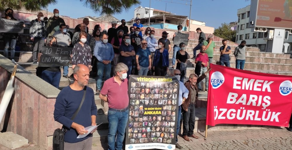 Cumhuriyet Meydanı’nda, Bergama Demokrasi Platformu adına BES temsilcisi Umut Aslan ve Yusuf Gunt tarafından okunan basın açıklamasında; “10 Ekim 2015 sabahında bu alanda yüreklerinde sevgi, gözlerinde gülümseme, dillerinde barış türküleri olan on binlerce kişi kardeşçe yan yana bulunuyordu. O karanlık dönemde hepimize umut veren bu coşkulu birliktelik saat 10’u 4 geçe birbiri ardına patlayan iki bomba ile kana bulandı” denildi.
