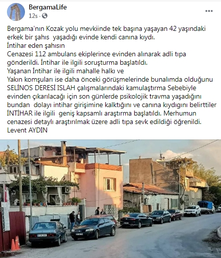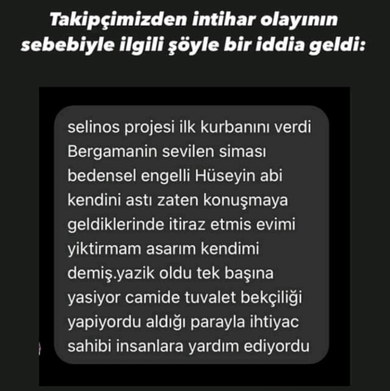 Bergama’da haber yayını yapan sosyal bir sosyal medya hesabından ise; “Selinos Projesi ilk kurbanını verdi. Bergama’nın sevilen siması, bedensel engelli Hüseyin abi kendini astı. Zaten konuşmaya geldiklerinde itiraz etmiş, evimi yıktırmam asarım kendimi demiş. Yazık oldu. Tek başına yaşıyor, camide tuvalet bekçiliği yapıyordu. Aldığı parayla ihtiyaç sahiplerine yardım ediyordu” cümlelerine yer verildi.