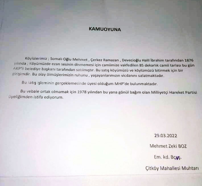 Bergama Çitköy mahalle muhtarı Mehmet Zeki Boz yaptığı yazılı açıklamada şu ifadeleri kullandı: “Köylülerimiz; Somali Oğlu Mehmet, Çerkez Ramazan, Devecioğlu Halil İbrahim tarafından 1876 yılında köyümüzde ezan sesinin dinmemesi için camiimize vakfedilen 85 dekarlık camii tarlası bugün AKP’li' belediye başkanı tarafından satılmıştır. Bu satış köyümüzü ve köylümüzü bitirmek için bir girişimdir. Bu olay ölmüşlerimizin ruhunu, yaşayanlarımızın vicdanını sızlatmaktadır. Bu satış işleminin gerçeklemesinde üyesi olduğum MHP'de bulunmaktadır. Bu vebale ortak olmamak için 1978 yılından bu yana gönül bağım olan Milliyetçi Hareket Partisi üyeliğimden istifa ediyorum.”