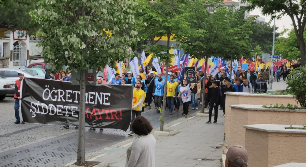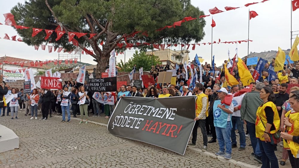 Bergama'daki protesto gösterilerinde "Öğretmene şiddete hayır", "Eğitimciye kalkan eller kırılsın", "Sıra kimde" pankartları açıldı.