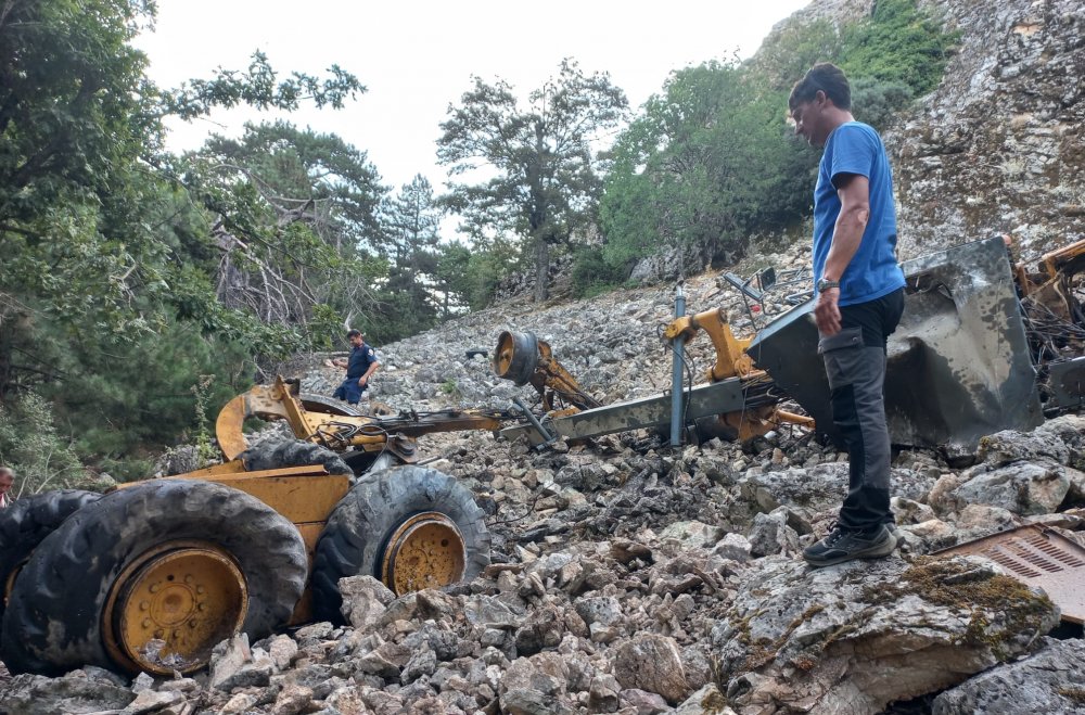 Vural Meydan’ı bulmak için saha çalışması yapan işçiler, operatörün iş makinesiyle 100 metrelik uçurumdan yuvarlanarak kaza yaptığını tespit ettiler.