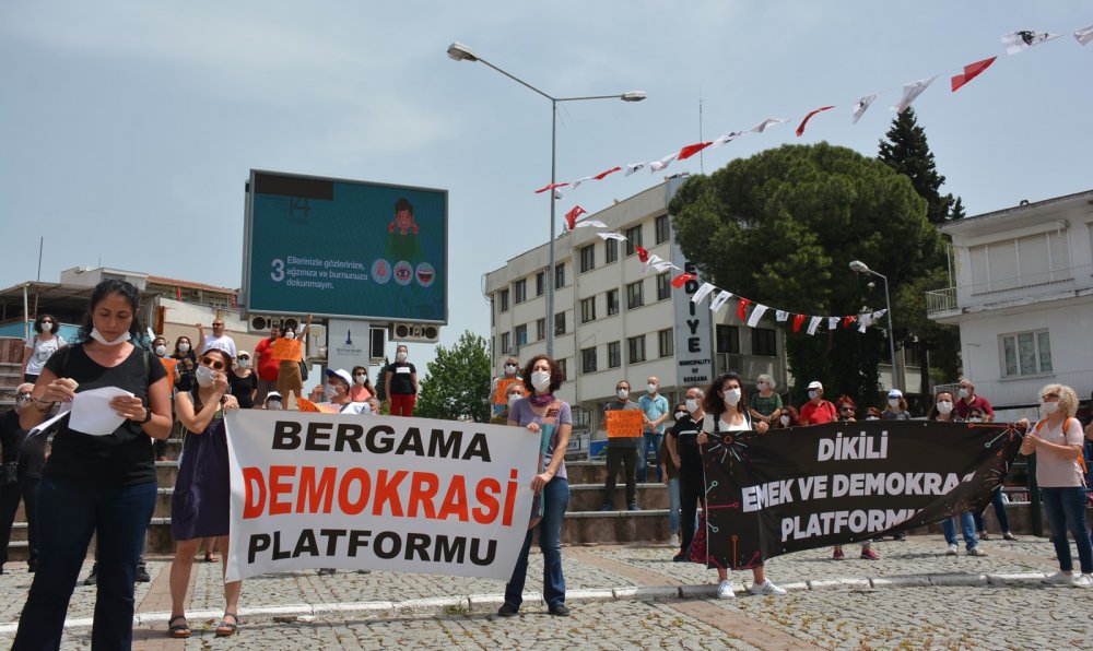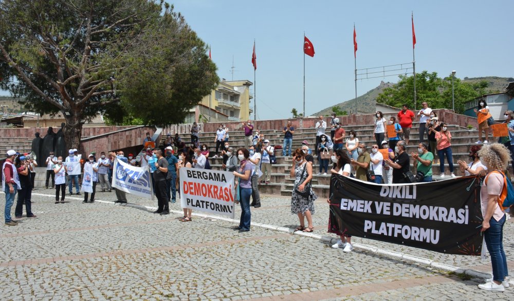 Bergama Demokrasi Platformu tarafından pandemi kurallarına uygun olarak Cumhuriyet Meydanı’nda gerçekleştirilen basın açıklamasına, Uzman Arkeolog Bülent Türkmen’in yanı sıra KESK, DİSK, Eğitim-Sen, İyi Parti İlçe Başkanı Nuri Çiftçi, CHP Meclis Üyesi Ali Bor, İyi Parti Meclis Üyesi Olgu Altuğ, Tüm-Bel-Sen İzmir 1 ve 2 No’lu Sendika yöneticileri, Bergama Çevre Platformu, Dikili Emek ve Demokrasi Platformu ve Dikili Kültür ve Çevre Platformu (DİKÇEP) katıldılar. Basın açıklamasına Bergama’nın AKP’li belediye başkanı Hakan Koştu tarafından işten çıkarılan 3 kadın işçi Nazlı Deniz Tan, Alev Çakır, Gonca Çetin, sözleşmeleri yenilenmeyen ve çevre davalarında ki başarılarıyla bilinen Av. Serdar Sinan, Av.Selen Akman Genç’te destek verdi.