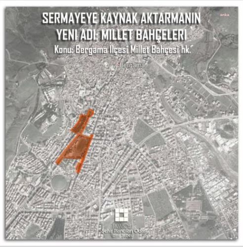 Bergama'da yapılması planlanan Millet Bahçesi Projesi'ne bir itiraz da Şehir Plancıları Odası'ndan geldi. Şehir Plancıları Odası (ŞPO) İzmir Şubesi, Bergama’da yapılması planlanan Millet Bahçesi projesini şehircilik ilkeleri, planlama esasları ve kamu yararına aykırı buldu.