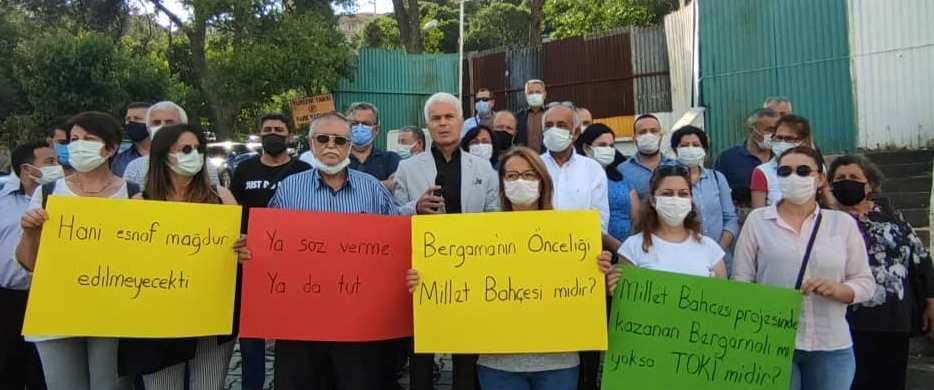 CHP İlçe Başkanı Mehmet Ecevit Canbaz, İYİ Parti İlçe Başkanı Nuri Çiftçi ve meclis üyelerinin katıldığı basın açıklamasında "Hani esnaf mağdur edilmeyecekti?", "Ya söz verme ya da tut", "Bergama'nın önceliği millet bahçesi midir?", "Millet bahçesi projesinde kazanan Bergama mı yoksa TOKİ midir?" yazılı dövizler açıldı.
