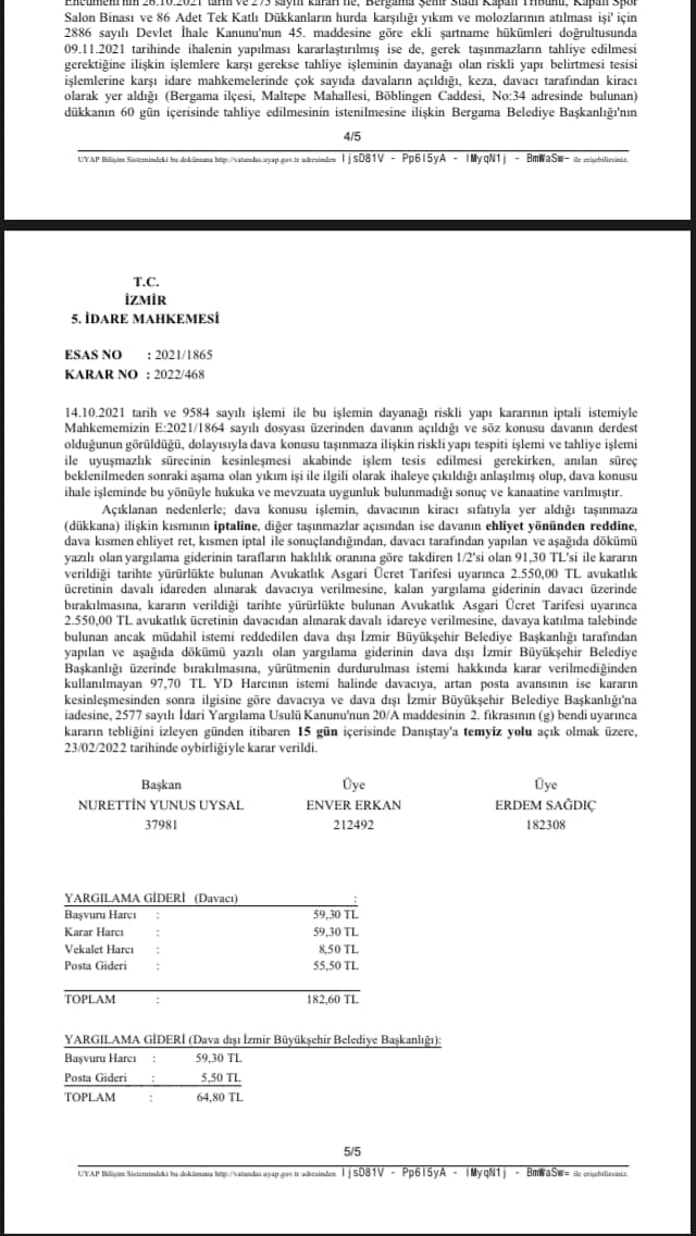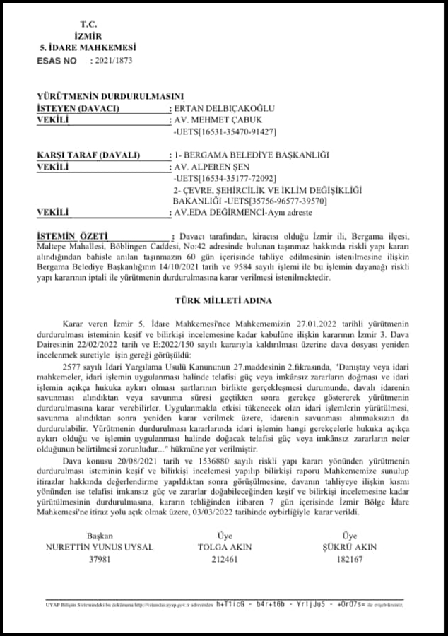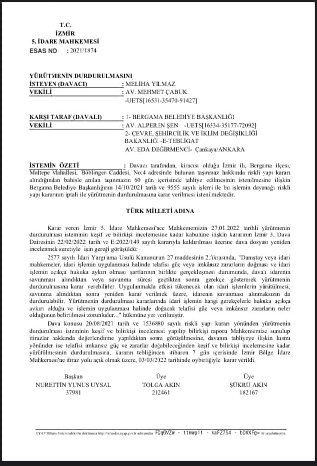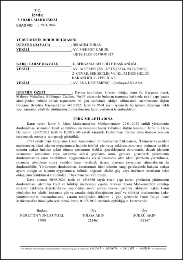 İzmir 5. İdare Mahkemesi, E:2021/1864, E:2021/1873 ve E:2021/1874 dosyalarda 03.03.2022 tarihinde verdiği kararlar ile “riskli yapı kararı yönünden yürütmenin durdurulması isteminin keşif ve bilirkişi incelemesi yapılıp bilirkişi raporunun Mahkemeye sunulmasından sonra görüşülmesine, tahliye işlemi yönünden ise keşif ve bilirkişi incelemesine kadar yürütmenin durdurulmasına” kararı verilmiş ve bu kararlar 03.03.2022 tarihinde Belediyeye tebliğ edilmiştir.